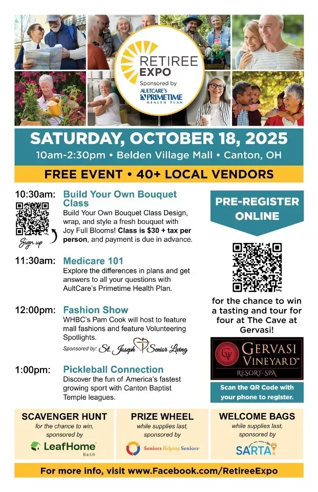 YOU’RE INVITED! The Retiree Expo, sponsored by AultCare’s PrimeTime Health Plan, is on Saturday, October 18, 2025, from 10:00 a.m. to 2:30 p.m. at Belden Village Mall, in Canton, OH. Admission is FREE! It’s an exciting and resourceful celebration for those on the road to retirement or already retired.