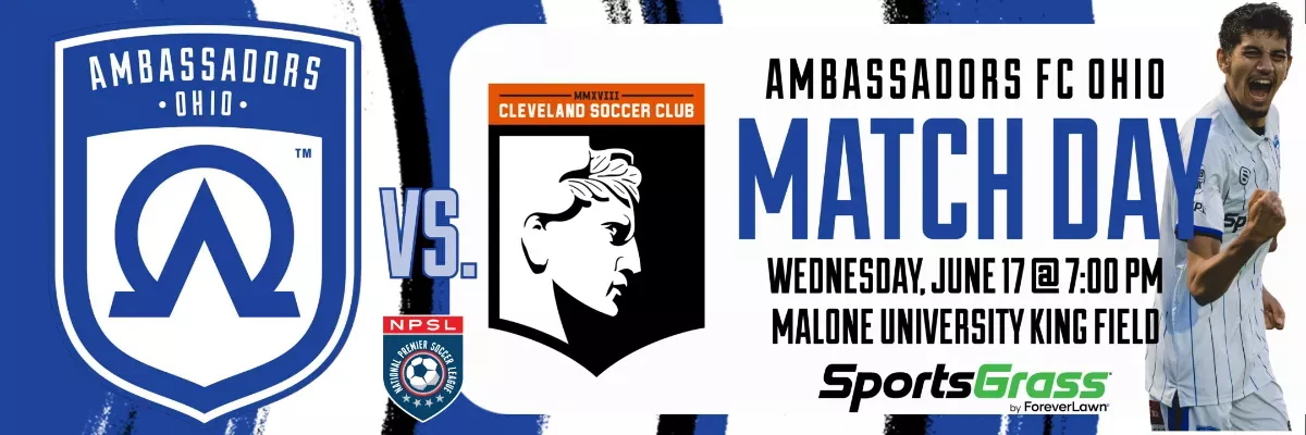 Ambassadors FC Ohio, Canton's own minor league/pre-professional soccer team, will host the "I-77 Derby" against Cleveland SC in a National Premier Soccer League match on Wednesday, June 17 @ 7:00 p.m. at King Field on the campus of Malone University