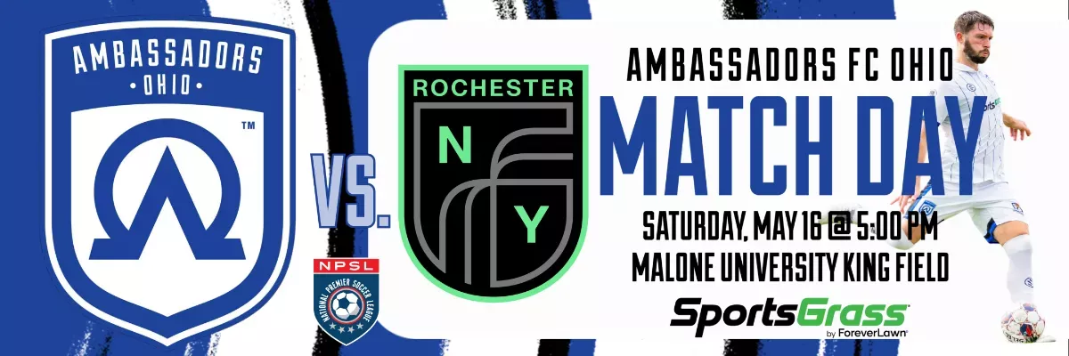 Ambassadors FC Ohio, Canton's only pre-professional/minor league soccer team, will host Rochester NY FC...a match up of last year's Great Lakes Conference semifinalists...in their National Premier Soccer League home opener on Saturday, May 16 @ 5:00 p.m. at King Field on the campus of Malone University