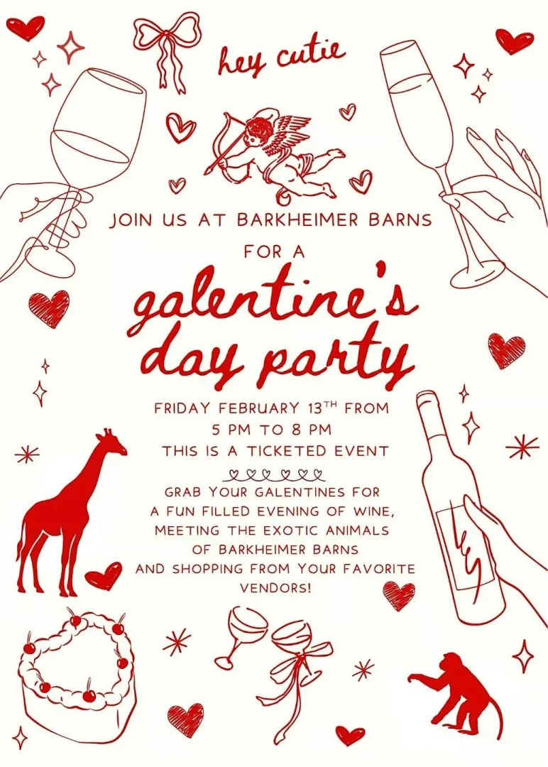 Grab your besties and join us for an unforgettable Galentine’s Night Out at Barkheimer Barns! This adults-only evening is the perfect blend of shopping, sipping, and once-in-a-lifetime animal encounters, all set inside our barn.