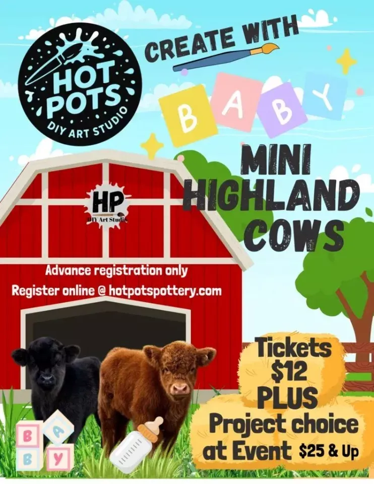 Admission includes entry to the event and Baby Cow meet & snuggle. Pottery projects are chosen the day of the event and are additional. We request a minimum $25 project purchase per ticket.