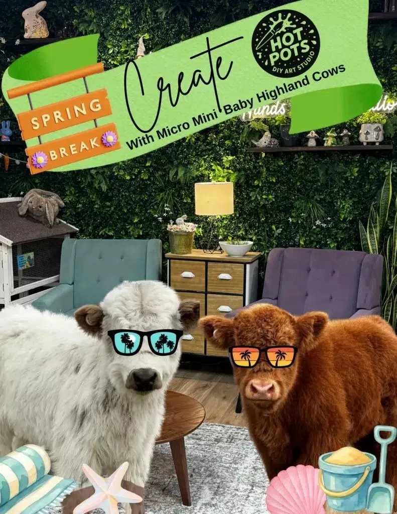 Celebrate Spring Break at Hot Pots with a fun and unforgettable visit to meet and create with the super cute and cuddly Mini Highland Cows!
