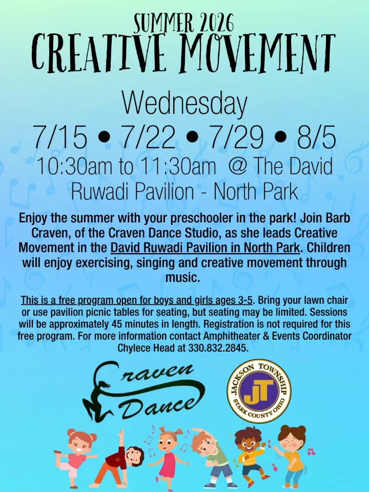 Enjoy the summer with your preschooler in the park! Join Barb Craven of the Craven Dance Studio as she leads Creative Movement. Held in the David Ruwadi Pavilion in Jackson's North Park, children will enjoy exercising, singing and creative movement through music.