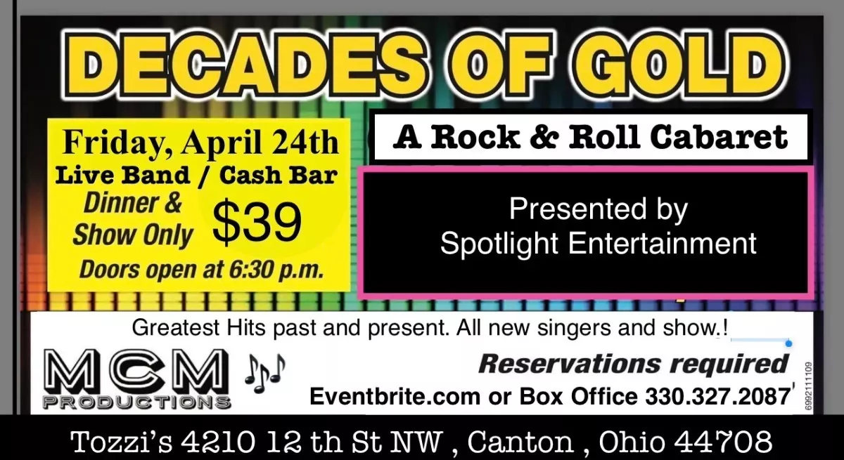 Join us for a lively rock & roll cabaret celebrating the greatest hits across the decades. Whether you're a classic rock fan or just love a good show, this event will have you singing and dancing all night long. Don't miss out on the fun and good vibes! We're celebrating the best rock music from the 60s, 70s, 80s, 90s to current, featuring hits from renowned artists such as Donna Summer, Kenny Rodgers, Marvin Gaye, Blood Sweat and Tears, Bruno Mars, Pat Benatar, Neil Diamond, Chicago and Heart, among many others.