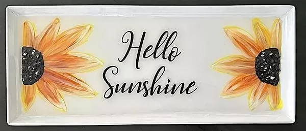 Join us for "hello sunshine", hand-painted charcuterie tray with crushed glass accents, sealed with resin.