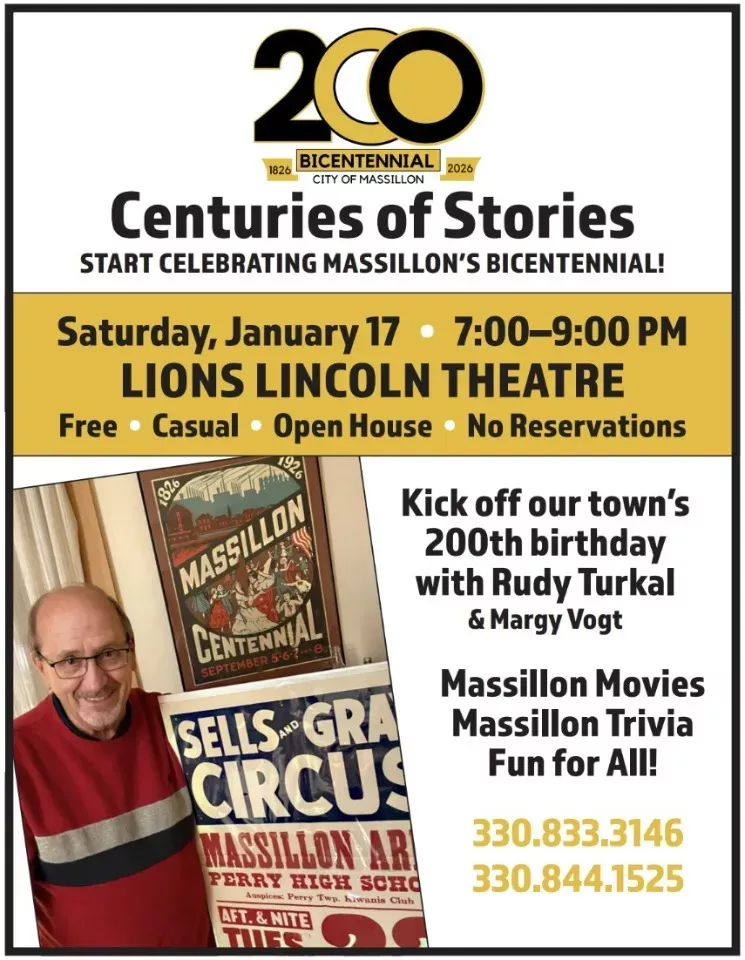 A free fun evening at the Lions Lincoln Theatre will launch Massillon’s Bicentennial celebration on Saturday, January 17, from 7:00 to 9:00 p.m. Everyone is welcome and no reservations are required. The event is casual. Guests can drop in or stay for the entire time.