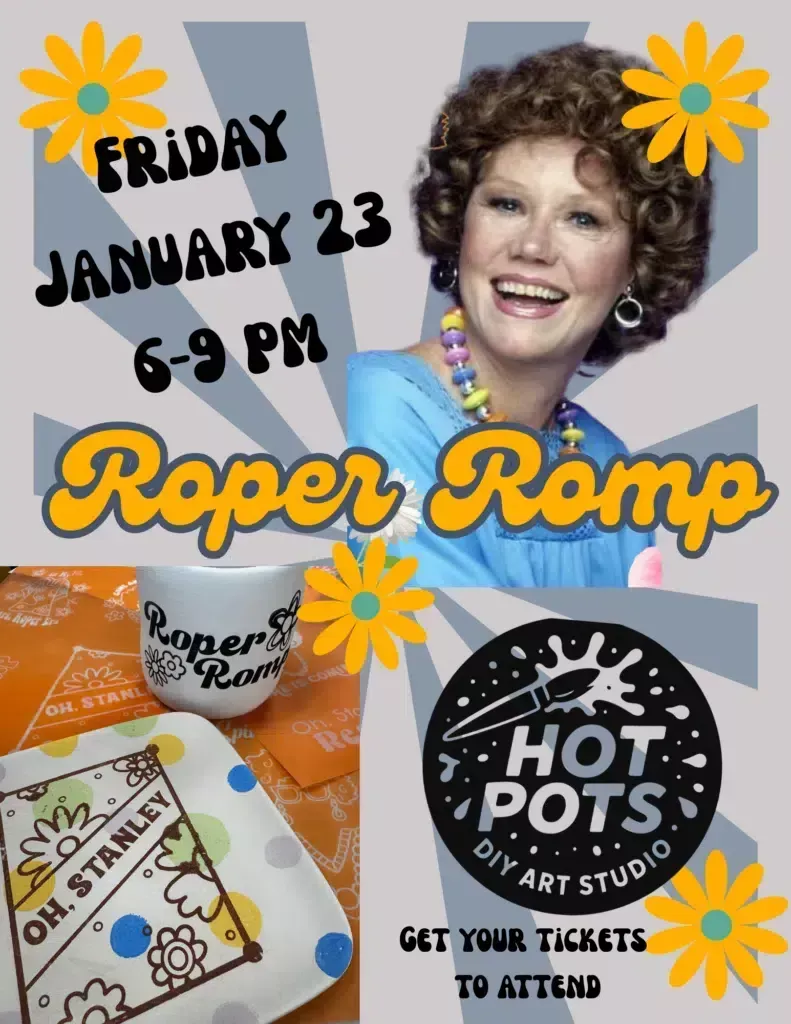 The Mrs. Roper Romp – A Three’s Company–Themed Create Night! Get your tickets for this upcoming FUN Event. Tickets are $10 plus your project choice that evening Come knock on our door and join us for a Mrs. Roper Romp at Hot Pots! We’re celebrating the iconic Three’s Company era with bold patterns, retro flair, and plenty of laughs. Create whatever you like or choose from our themed project ideas inspired by Mrs. Roper’s unforgettable style. We’ll have stencils and exclusive themed screen prints to make designing easy—no experience needed!