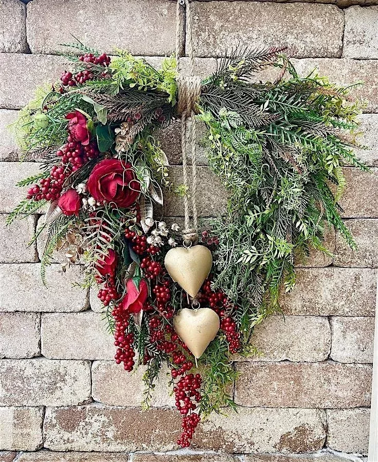 Celebrate love & nature with this timeless symbol of kindness and love. Perfect for gracing your front door or garden gate thru the Winter. Come join us for a Wine & Wreaths evening. A great Ladies night out or make it a Date night! Learn to weave evergreens, roses and berries to create this charming and fragrant heart wreath, perfect for gracing your front door or garden gate trhougout the winter. All supplies included. Size: 14”wide, 17” tall.