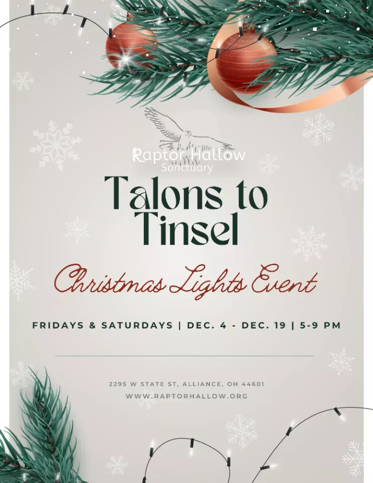 Talons to Tinsel is Raptor Hallow Sanctuary’s festive Christmas light experience held Friday and Saturday evenings throughout December. Stroll a beautifully decorated woodland trail filled with twinkling lights, holiday displays, wildlife ambassadors, hot chocolate, and s’mores! Children can enjoy our Christmas Tree Trail, where every child receives a special gift. On select nights, Santa and Mrs. Claus will be visiting. All proceeds directly support the care and conservation of our wildlife.