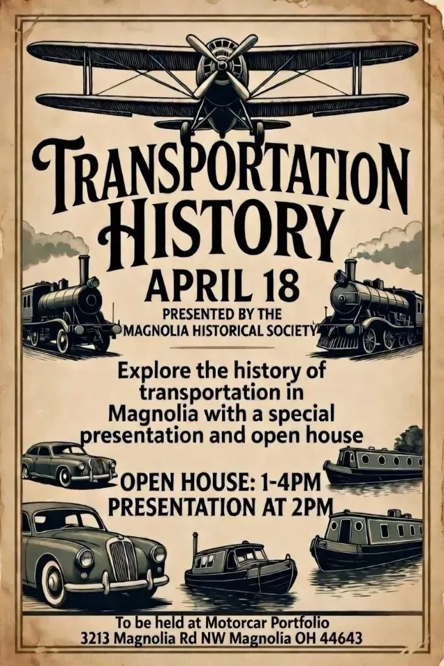 Displays will feature Magnolia Airport, the B&O and Pennsylvania Trains, the Dragstrip, Automobile History, and the Sandy & Beaver Canal. Megan Boyd, owner of Motorcar Portfolio, will present “Vintage Automobile History and Current Market Trends”.
