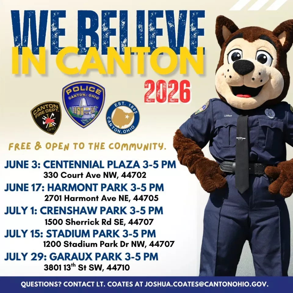 Join the Canton Police Department for a summer series of free, family-friendly events taking place across the city. Each stop is an opportunity to connect with neighbors, meet local heroes, and enjoy a fun afternoon in your community park!